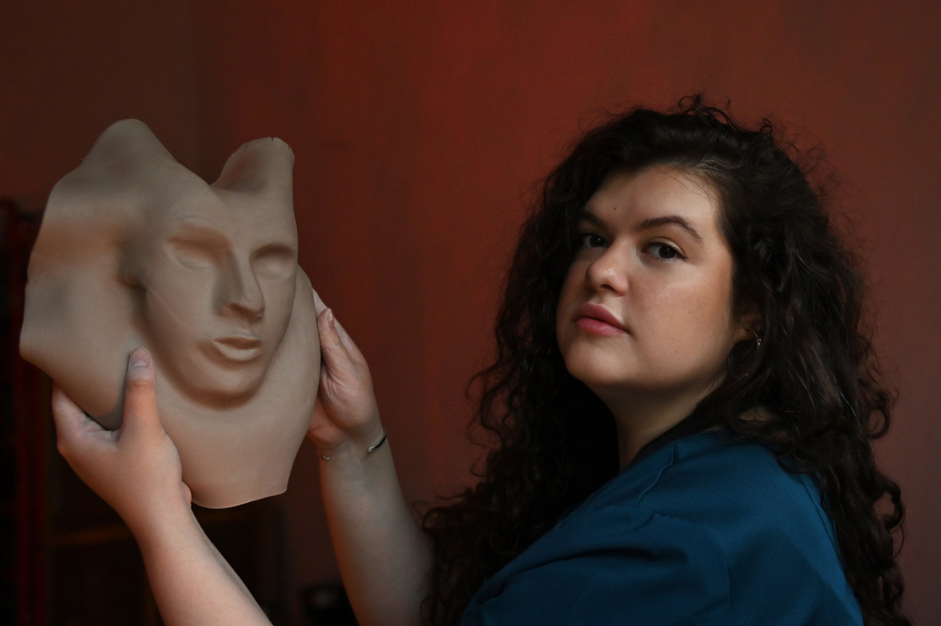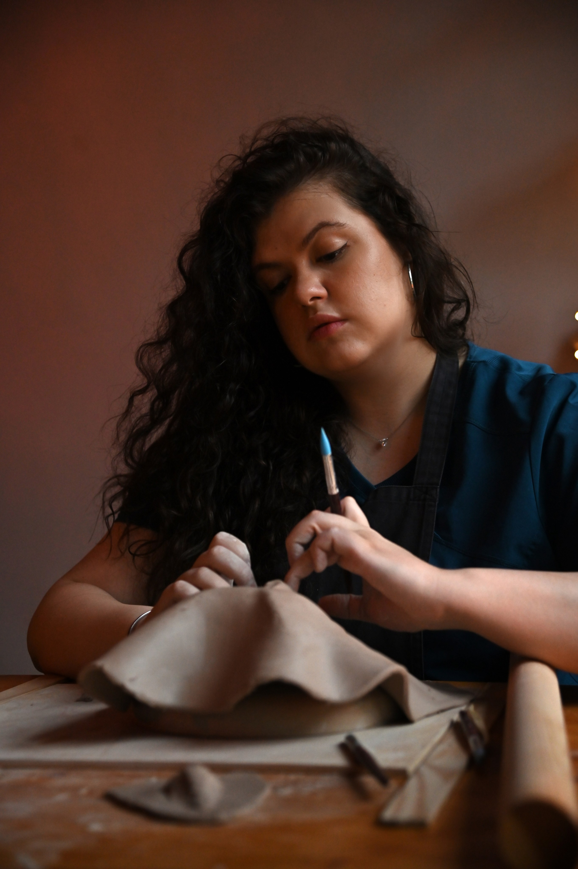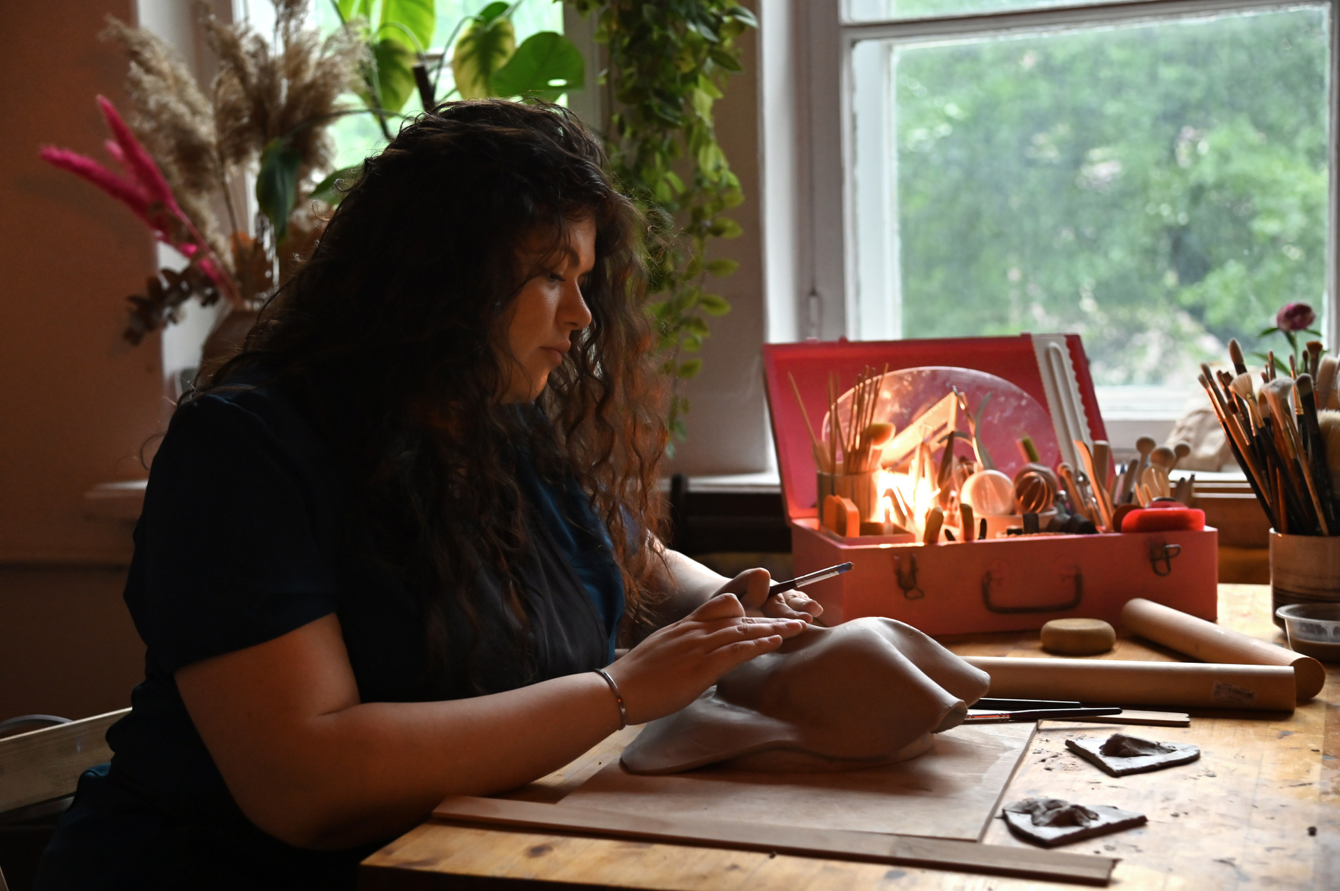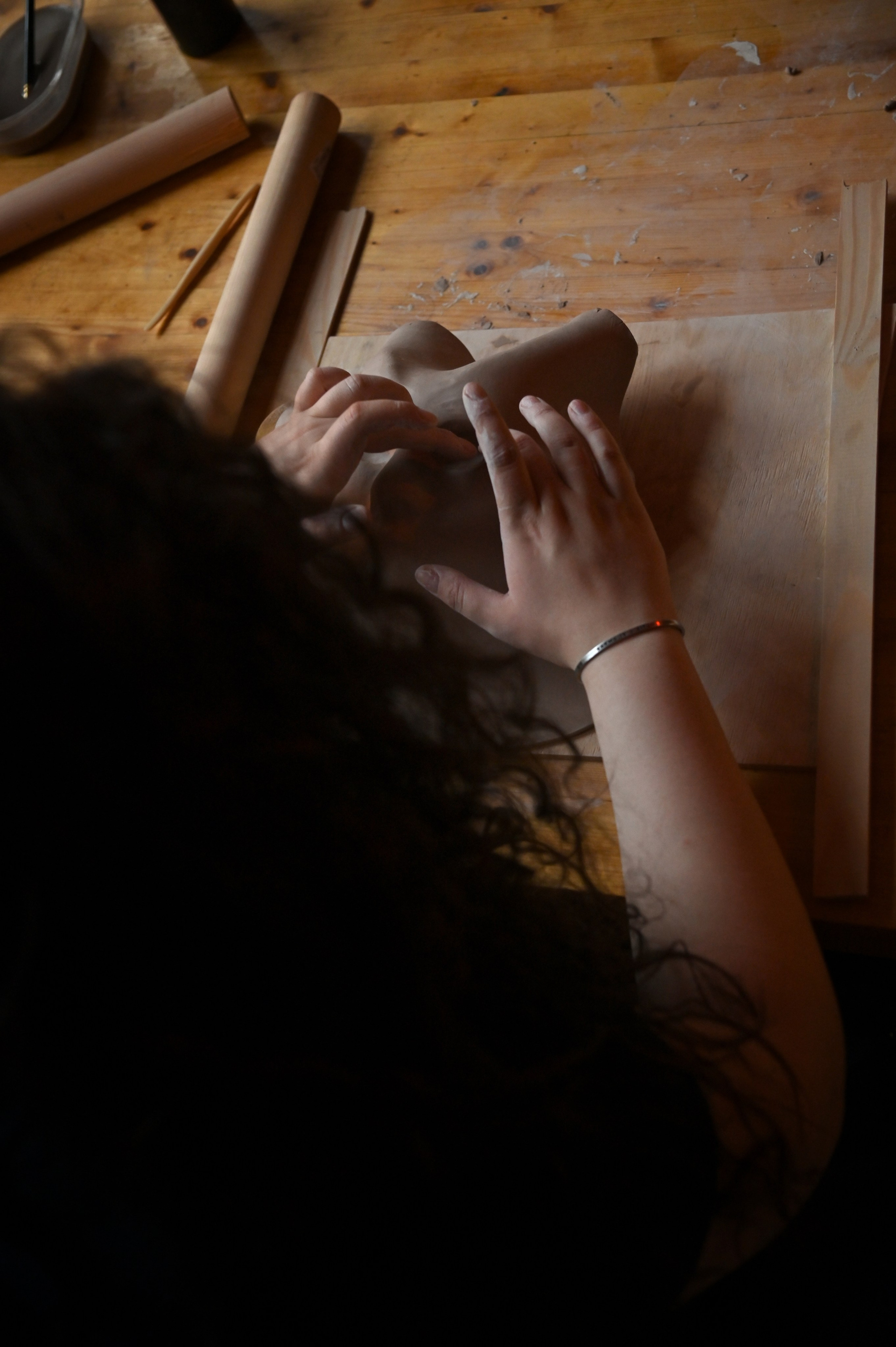 Гончарная студия, Яна в рабочем костюме, но без маски конечно, волосы в пучок, вся в работе и глине. Что-то мнет.