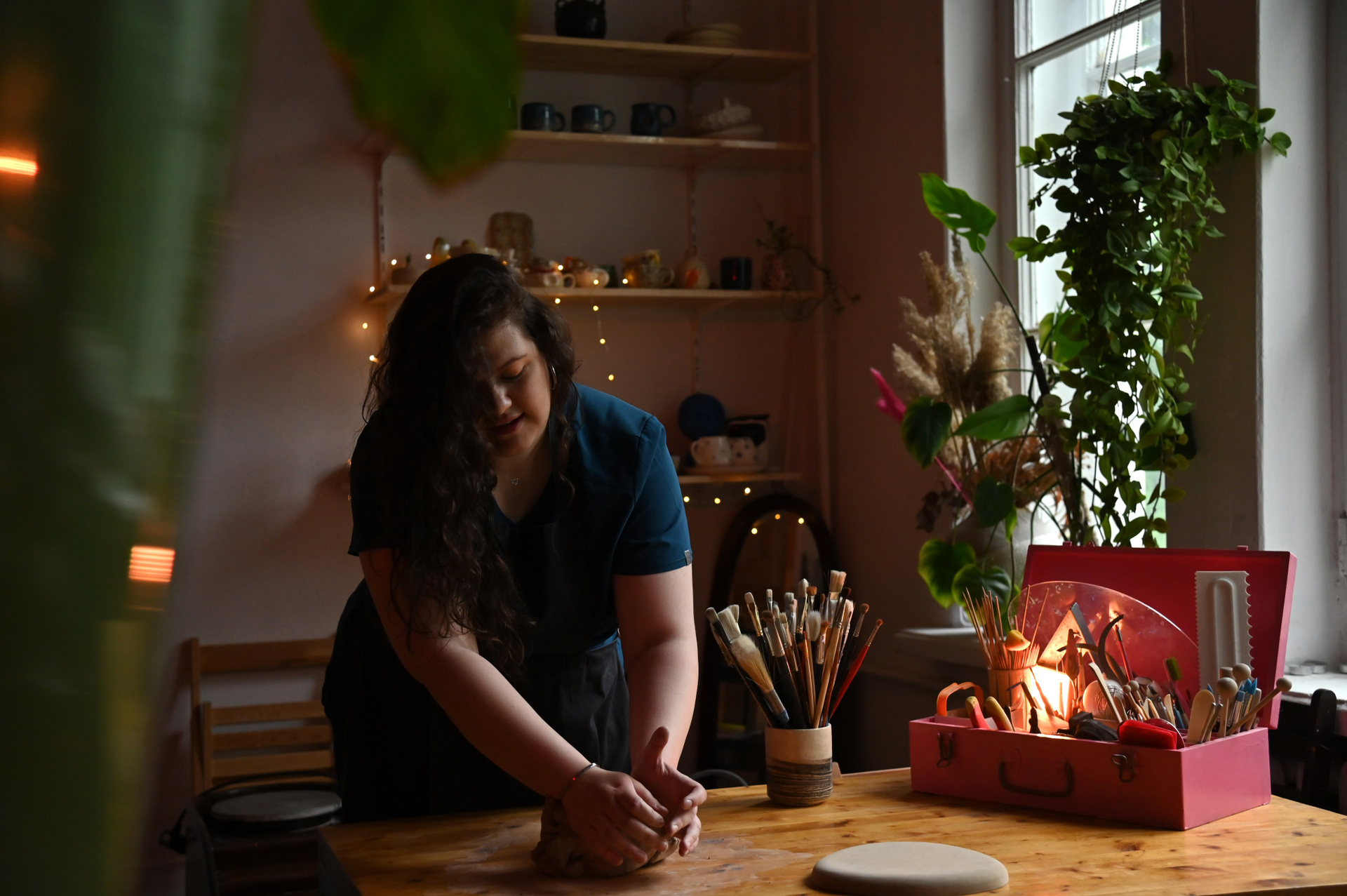 Мы с Яной подобрали студию, обговорили детали. Были технические моменты которые я решала с мастером гончарной студии. Мы купили необходимый реквизит и поехали создавать красоту. В задумке была солнечная погода, но естественно в день съемки шел проливной дождь, возможности перенести фотоссесию не было, поэтому свет импровизировали. Я взяла с собой гирлянду и дополнительное освещение, которое помогло создать атмосферу уюта и творчества.